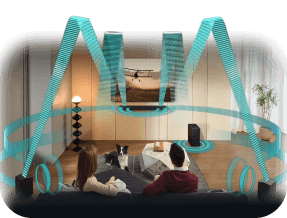 Dźwięk odbija się od ścian i sufitu, wypełniając całą przestrzeń. Dzięki dołączonym do zestawu bezprzewodowym głośnikom tylnym dźwięk porusza się wokół Ciebie i ponad Tobą, odbijając się od ścian oraz sufitu. Wszystko, by zapewnić Ci zapierającą dech w piersiach jakość kinowego dźwięku w Twoim domu. Nowa funkcja dodatkowo pozwala umieścić głośniki zarówno z przodu, jak i z tyłu, abyś mógł wszędzie cieszyć się niezmienną jakością dźwięku.